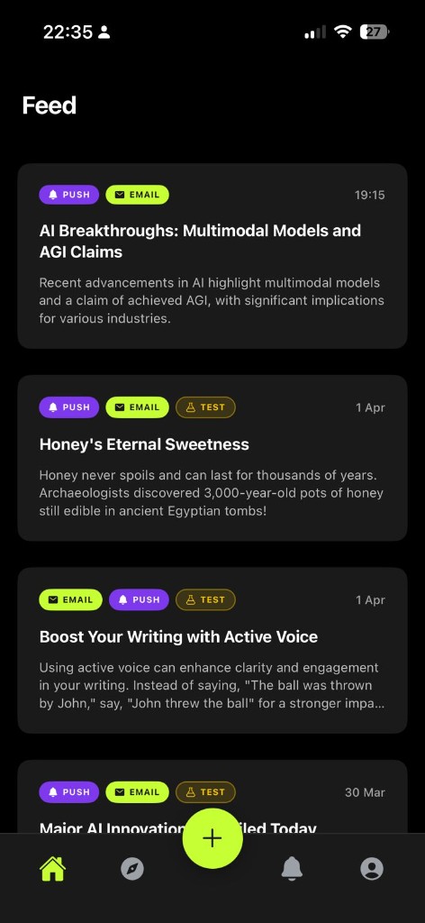 A mobile application that uses AI to create custom notifications about subjects requested by the user. Get the information you want, when you want it.
